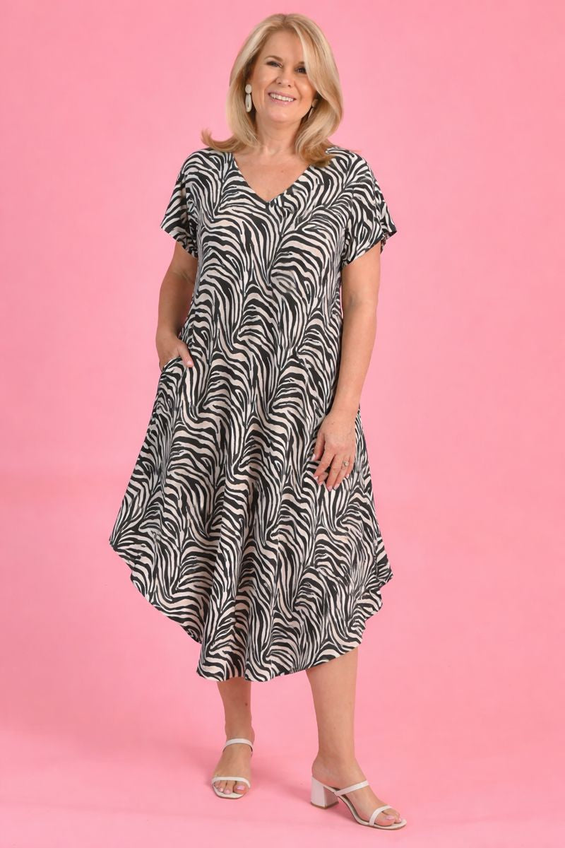 Our Great Harbour Dress is a relaxed fitting piece featuring a high/low curved hemline & a slight V neck.
