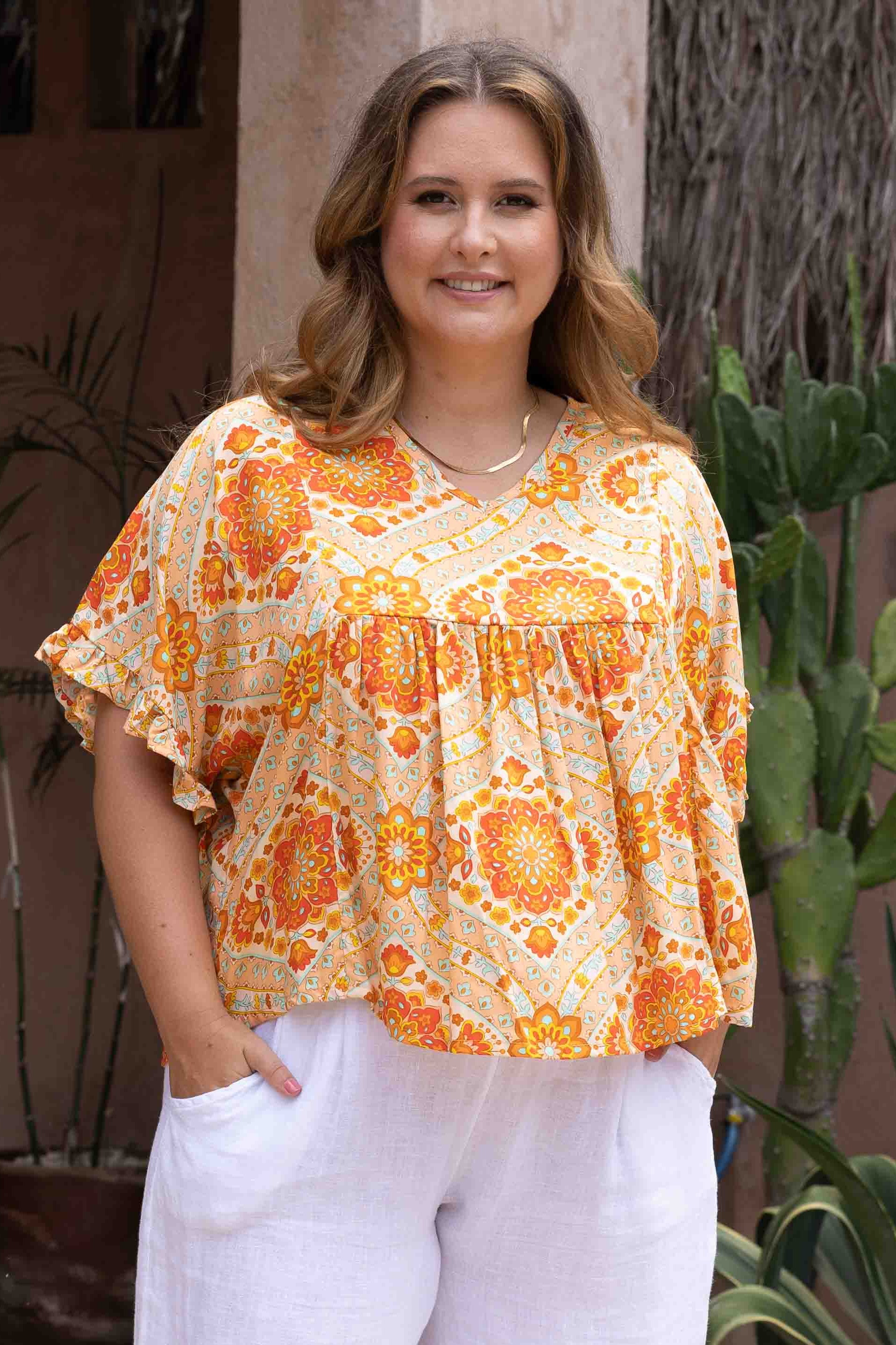 Our Kelly top is a fan favourite for good reason! With gorgeous 1/2 sleeve with small frill detailing and a gorgeous v-neck with beautiful bottom detailing! So easy to co ordinate with our beautiful range of pants.