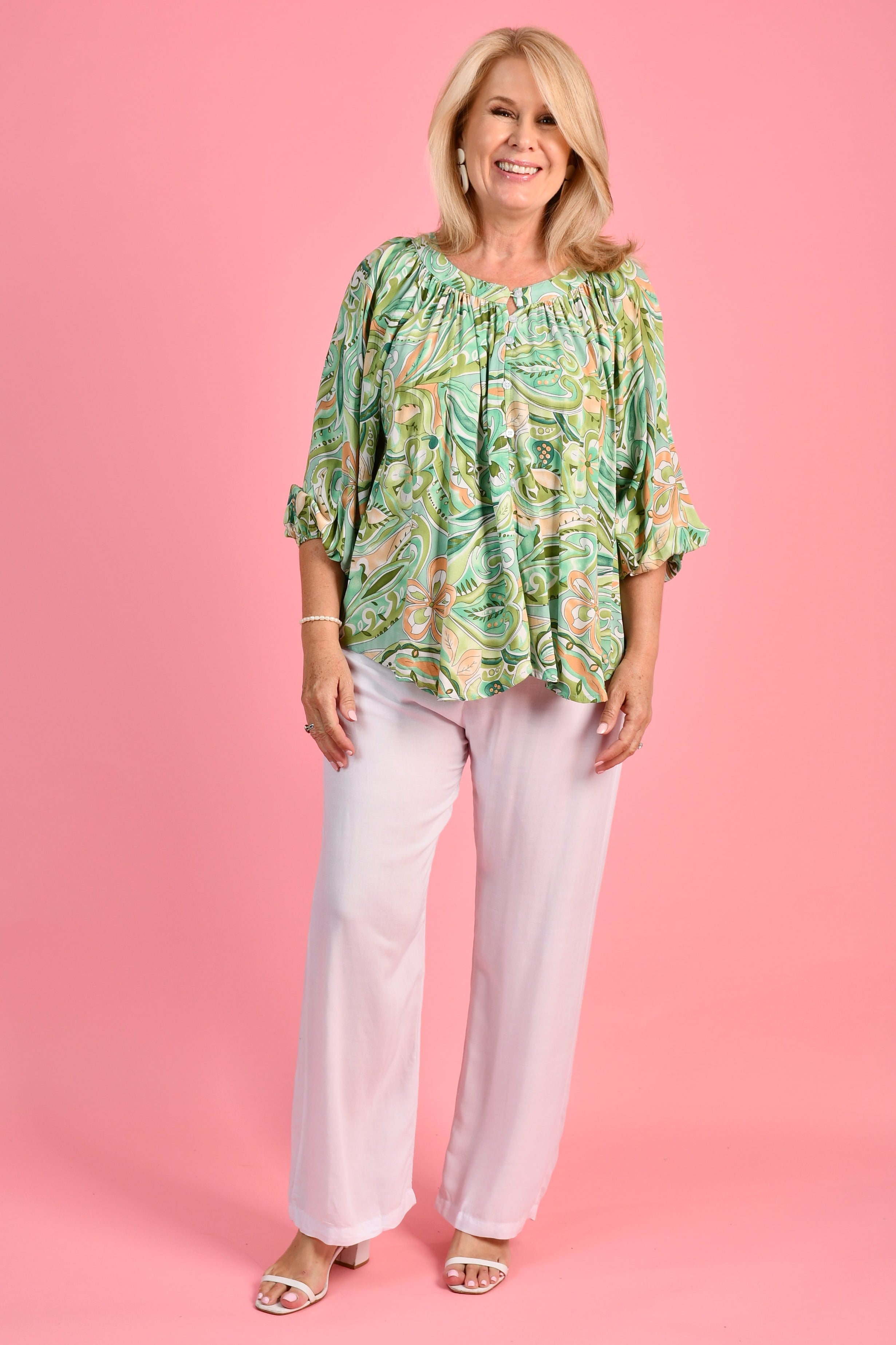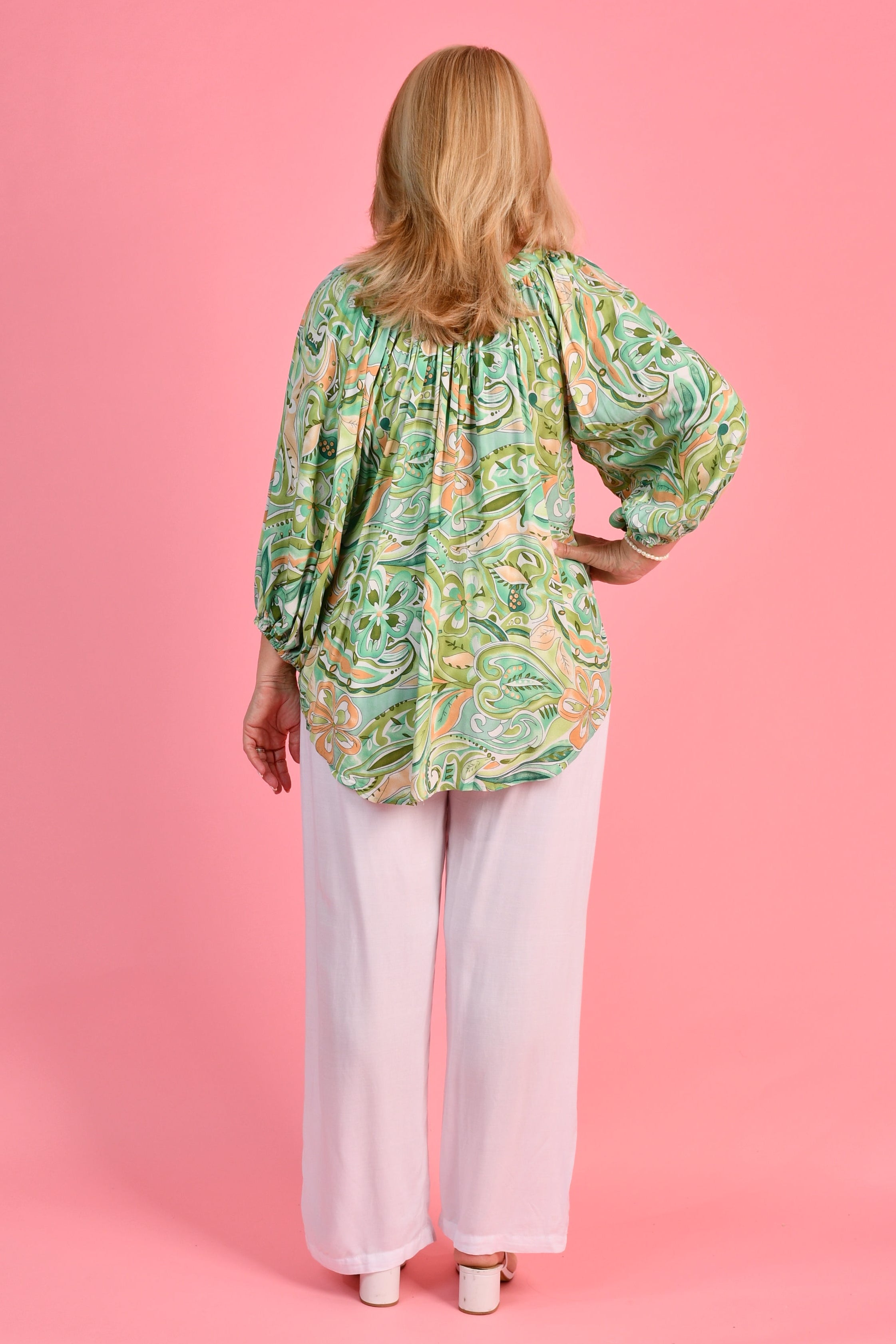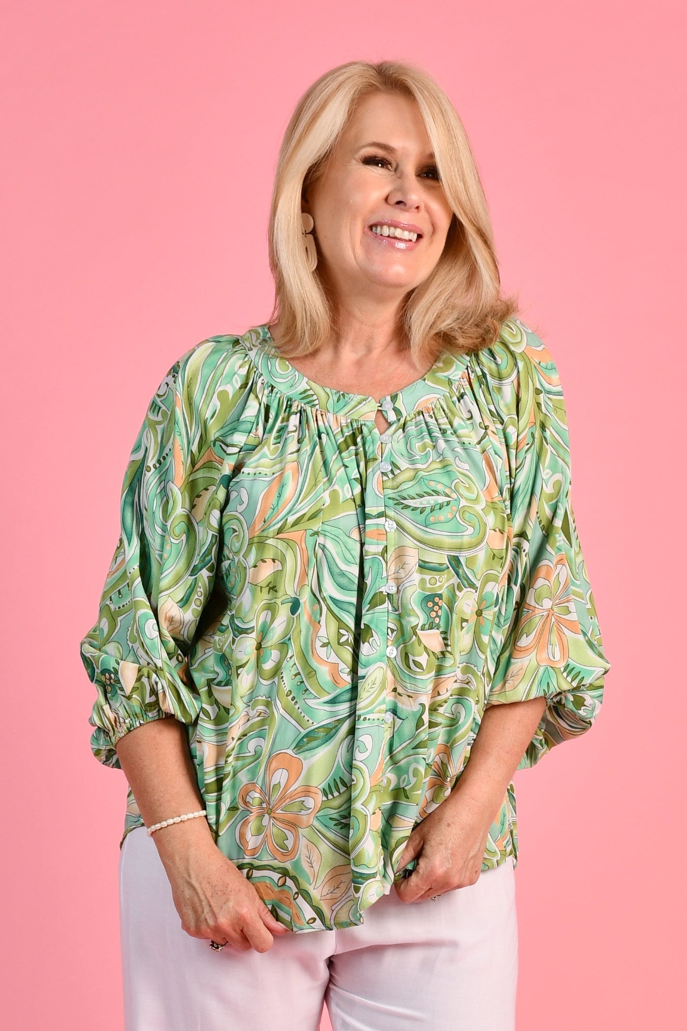 VBLT999 - HEPBURN 3/4 SLEEVE TOP - 70'S SWIRL GREEN