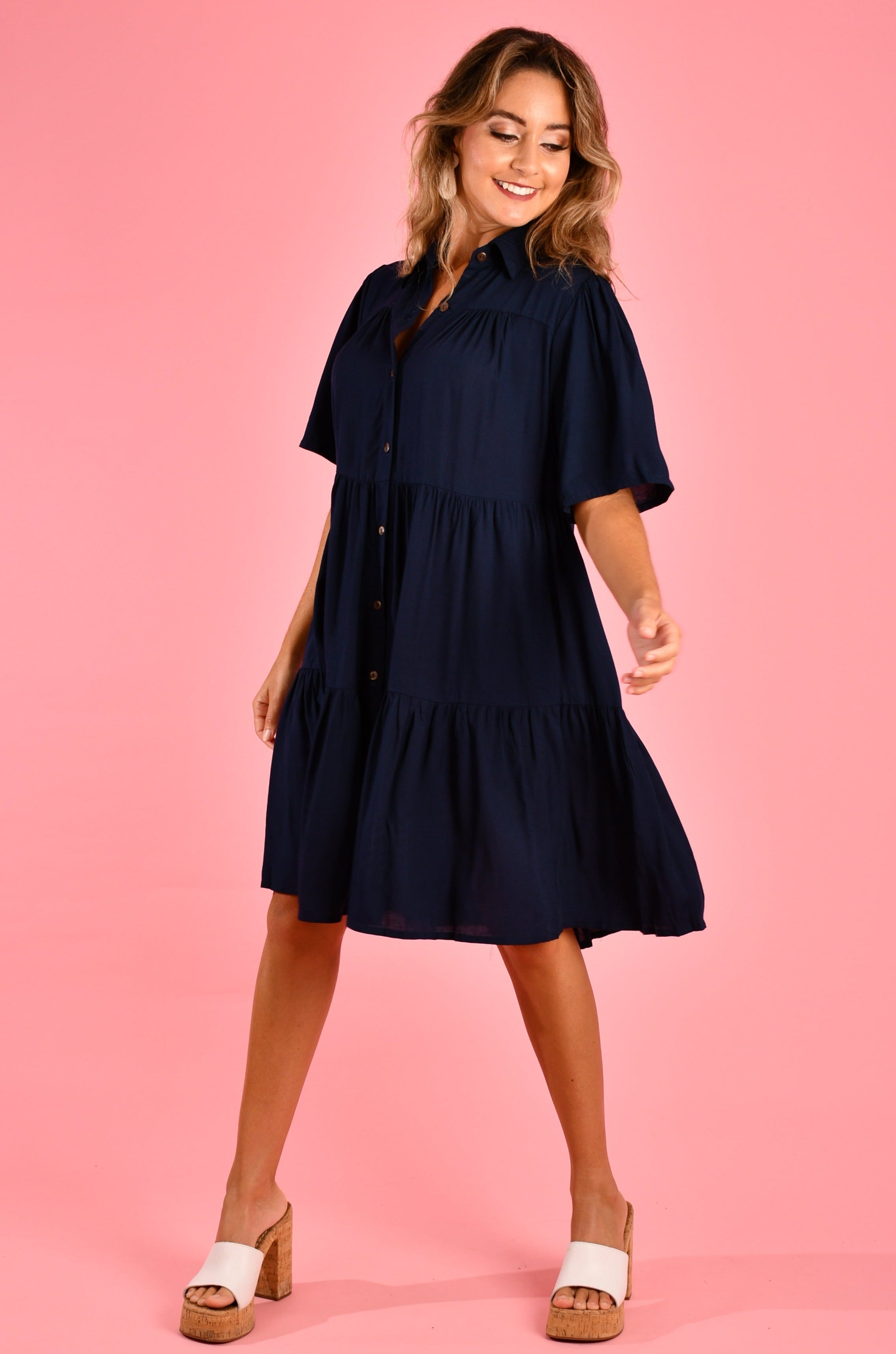 Our Victoria dress is simply the cutest! This tier button-up dress has slightly puffy sleeves and an adorable collar detail.