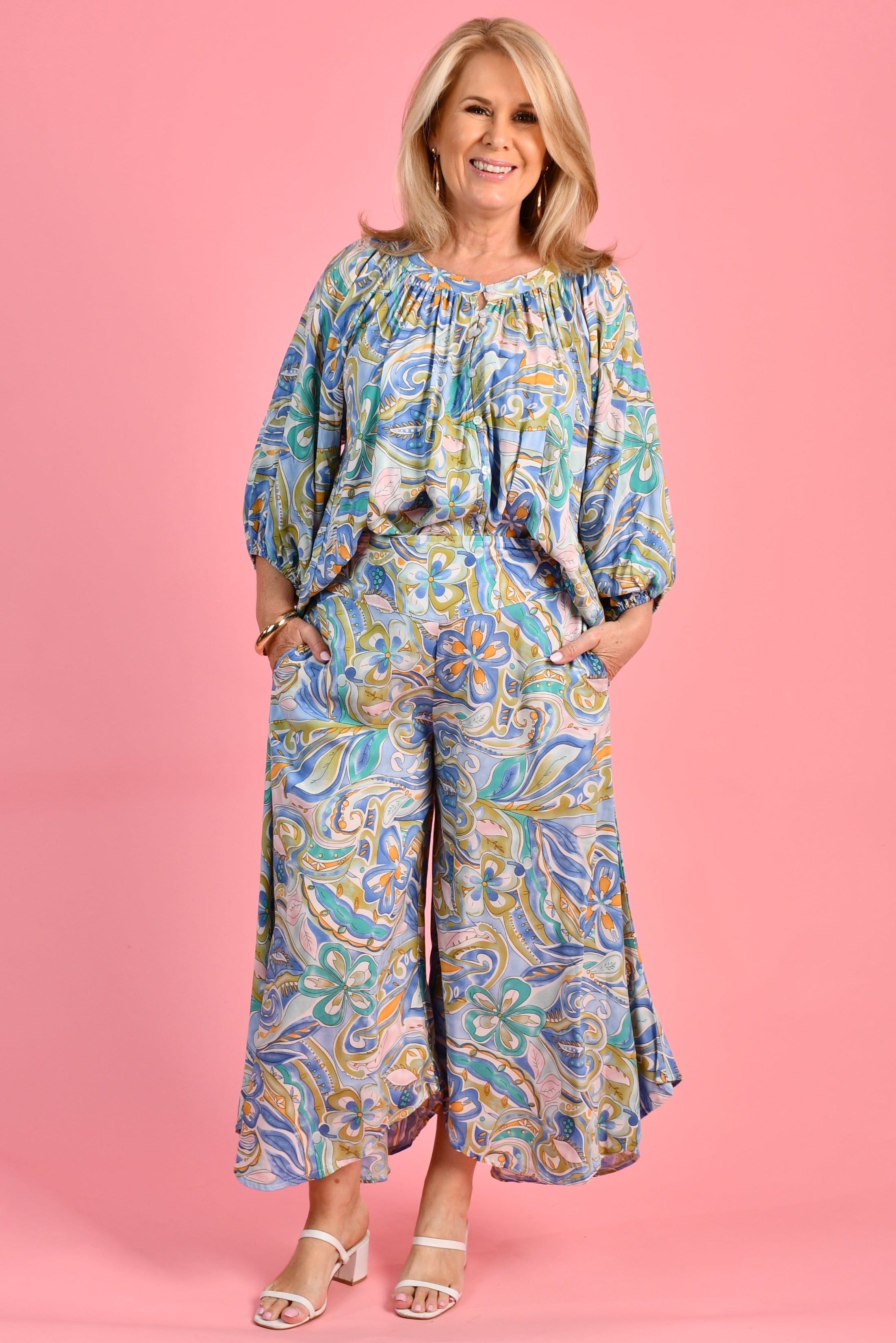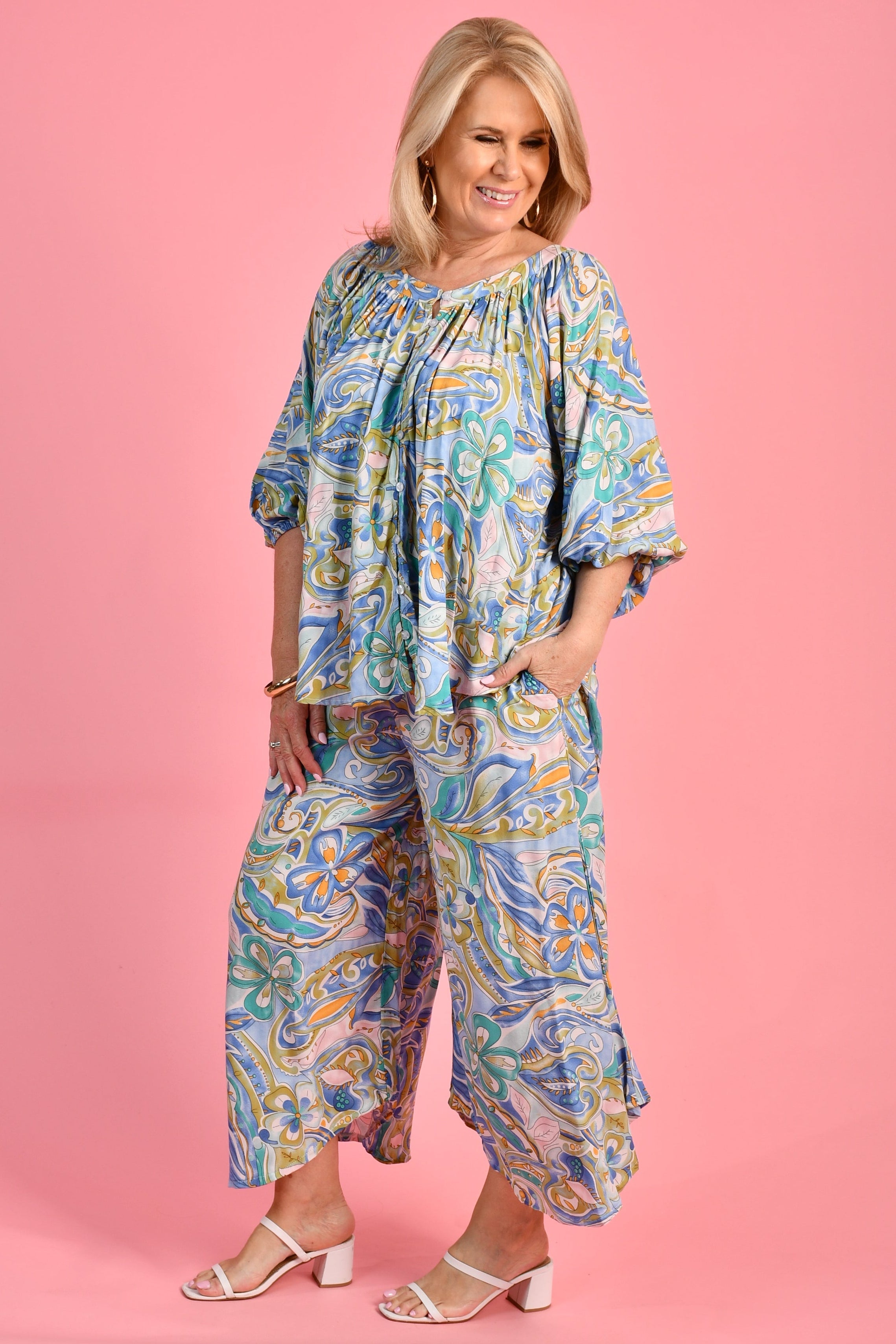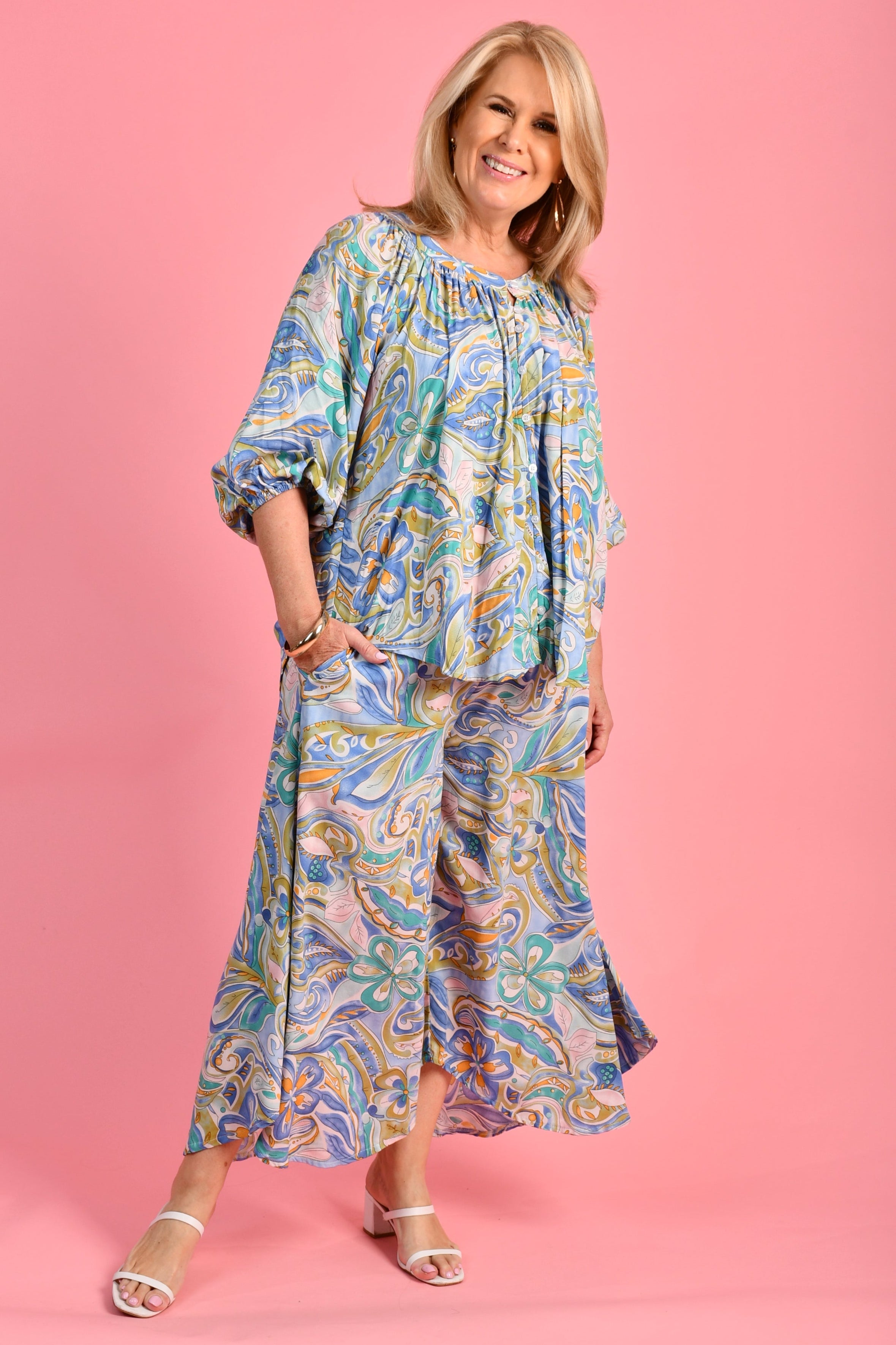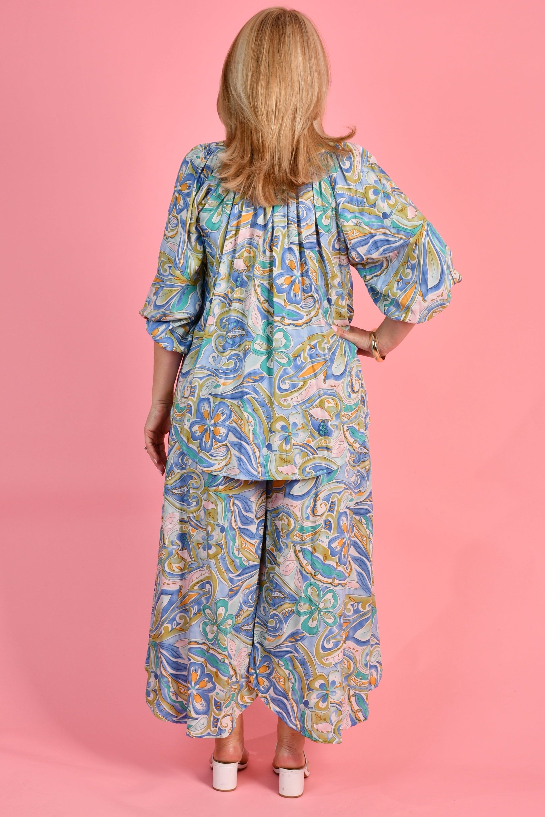 VBLT999 - HEPBURN 3/4 SLEEVE TOP - 70'S SWIRL BLUE