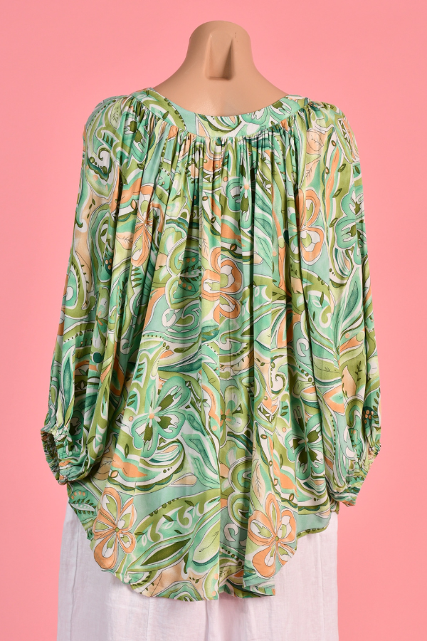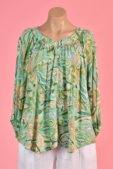 VBLT999 - HEPBURN 3/4 SLEEVE TOP - 70'S SWIRL GREEN