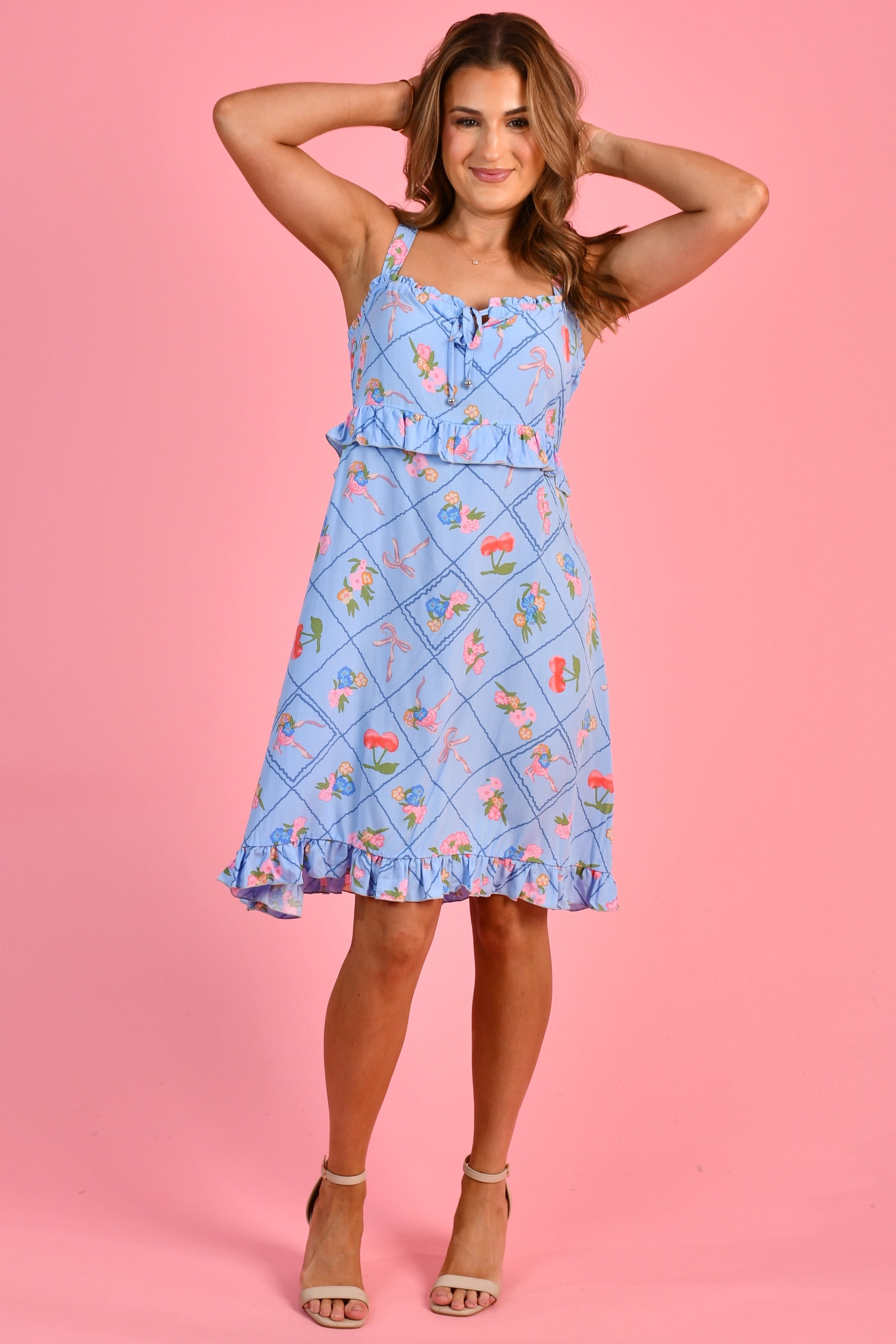 Our Sunset Ruffle Dress in our beautiful Bows & Blooms print has landed!🌸🎀