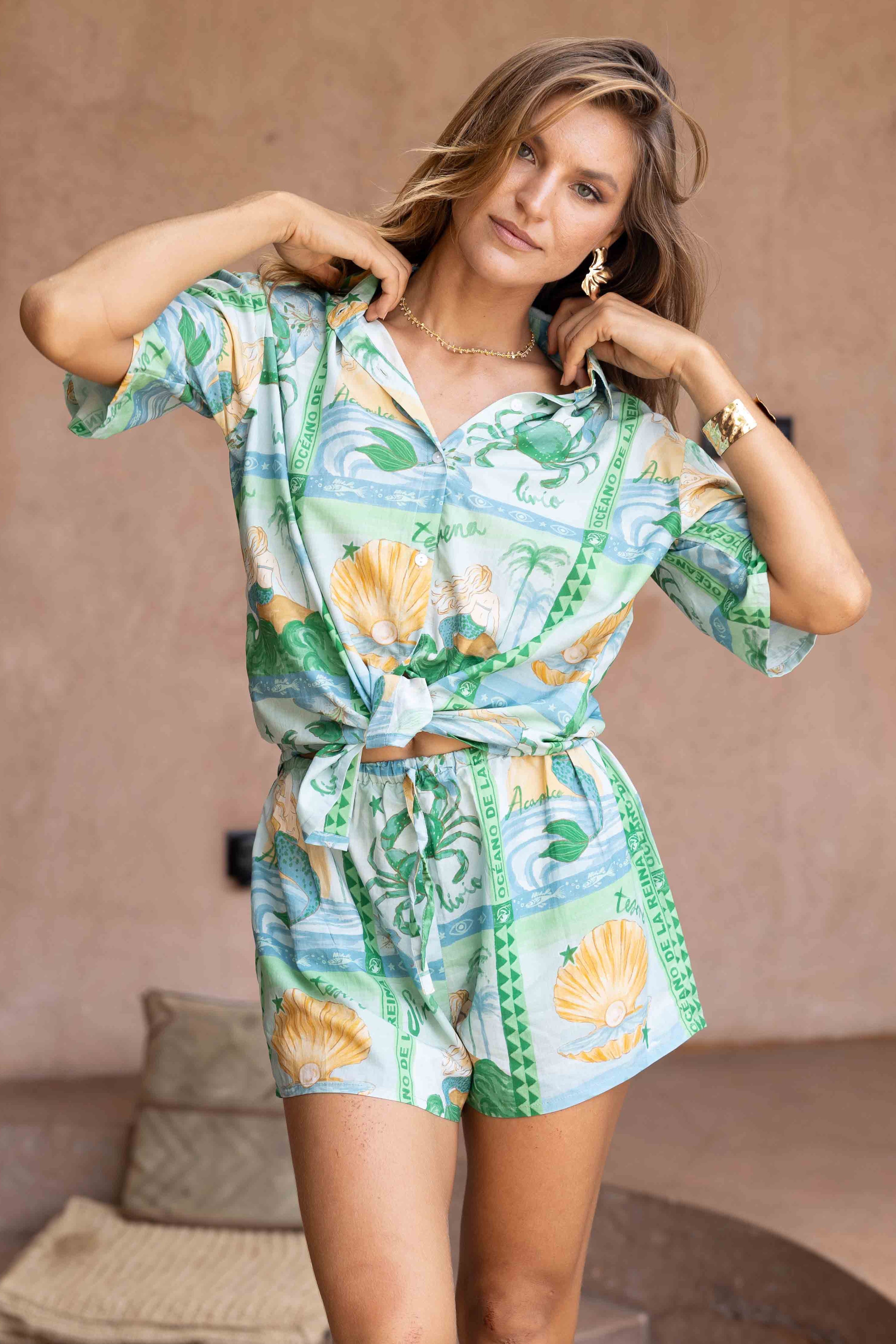 The Yacht Shirt is a vibrant and breezy short-sleeve button-up top, featuring a playful, pattern inspired by the Argentinian Streets. This shirt combines comfort with effortless style, making it ideal for summer outings or casual gatherings.