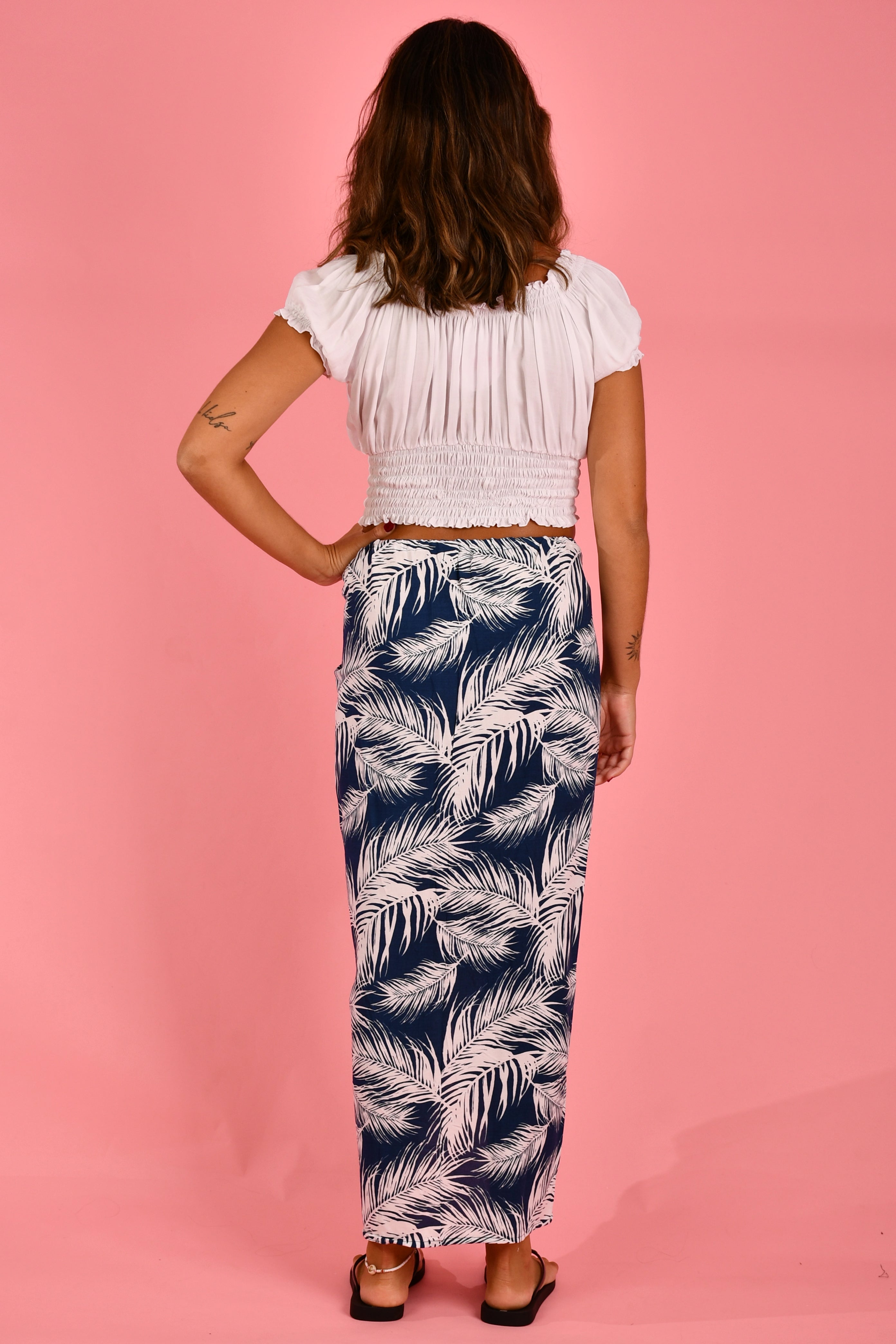 VBLK091 - LONG COCONUT SKIRT W/CLASP - PALM NAVY/WHITE